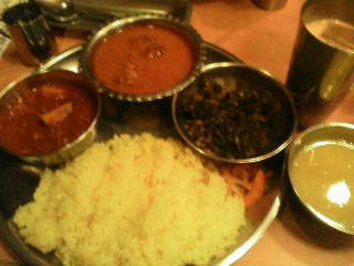 カレー2種類+サグ+ダール豆のスープ+漬物+飲物のセット。